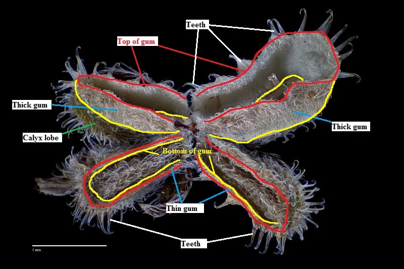 In floras, the "gum plus teeth" is often called the ornamentation of the nutlet, with the gum, or sometimes the "gum plus teeth", called a wing or nutlet margin. I won't use that terminology since I've found that using "gum plus teeth" is much easier for the average botanist to understand when looking at the nutlets in the field.