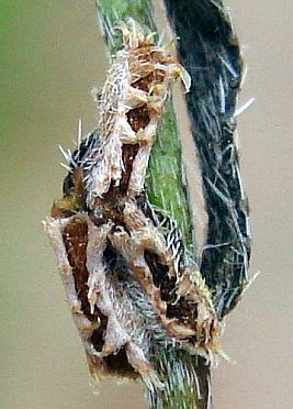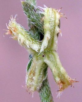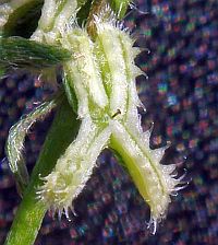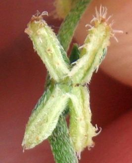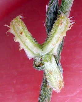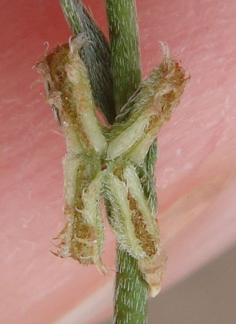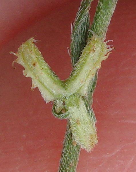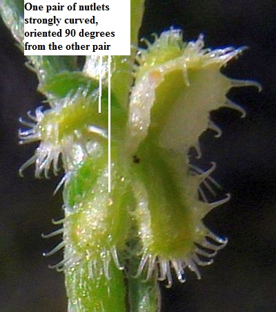 Note that when the nutlets are not identical, the widest pair of nutlets is on the left at one node and the right at the next node when viewing the stem vertically, and the appearance of the nutlets depends on whether you are viewing the stem with the base of the stem at the top of the pix (free end of hairs down from base in the pix) or at the bottom of the pix (free end of hairs up from base in pix). The hairs are appressed toward the tip of the stem, so careful examination of the hairs in a pix will usually show which end of the hairs is not attached..