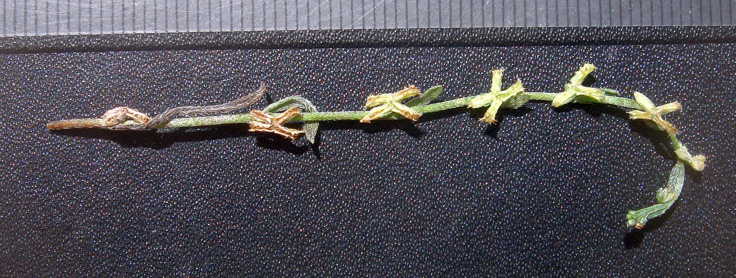 Fig. 2. A flowering and fruiting stem of P. penicillata, showing the flowers at left at the top of the stem, developing into young fruit, and then mature fruit in the middle of the stem. On this stem, the oldest fruit is different from the mature nutlets in having one nutlets not fully formed, but this can happen to any fruit anywhere along the stem. See Fig. 8 for another example of how the nutlets can differ along the stem.