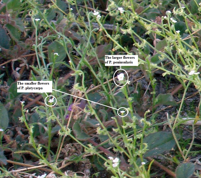 The numbers in Table 1 appear to show that the corolla width of P. peninsularis probably is the largest of all Pectocarya species. However, due to some species, including P. peninsularis, having only upper limits for the corolla width, and due to the known variation in corolla size between first and last flowers, not taken into account in Table 1, its much-larger corolla width is not easy to deduce from Table 1. However, my experience is that it is indeed true that P. peninsularis has significantly-larger flowers than the other species. For example, in a photograph of P. peninsularis and P. platycarpa growing together, the corollas of P. peninsularis clearly stand out. If you look closely, you can see the corollas of P. platycarpa in the linked picture as well, and they look consistent with being roughly half the corolla width, four times smaller in area.