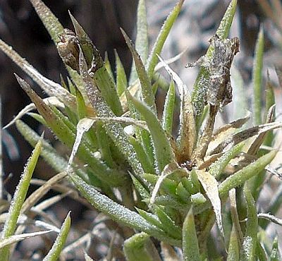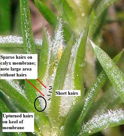 In Fig. 2, it might be a little harder to distinguish the two species using just the hairs. As Carolyn pointed out, the hairs on the calyx membrane of P. austromontana are not as long, not as spreading, and tend to be curved up. Fortunately, the calyx membrane in this case is distinctly keeled, leaving little doubt that this plant is P. austromontana. The hairiness of the leaves, and the shape of the leaf tips, confirm this determination as well (see below).