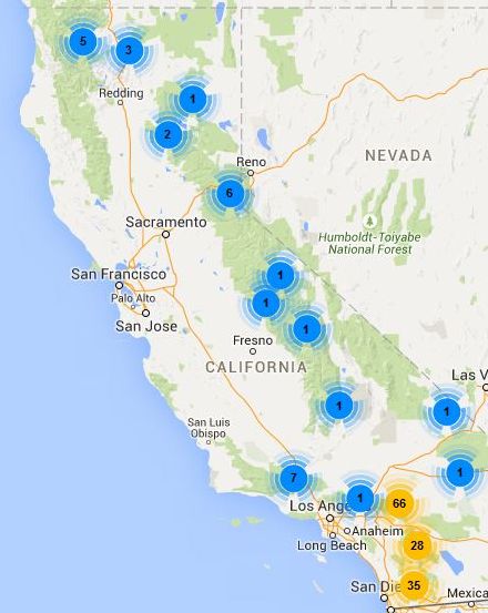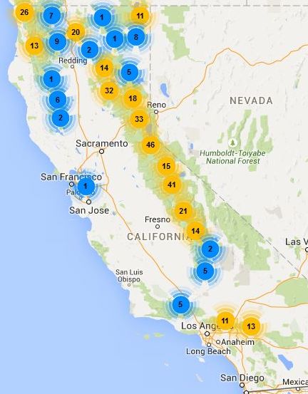 Fig. 5. Voucher distribution of Phlox austromontana (left) and Phlox diffusa (right). The numbers in the circles are the number of vouchers (including duplicate vouchers) within a small distance from the center of each circle. I consider it to be highly probable that the blue circles in the distribution for P. austromontana are misdetermined vouchers of P. diffusa, and hence the true geographic distribution for P. austromontana is probably that shown only by the yellow circles. Vouchers for P. diffusa are all in the San Gabriel and San Bernardino Mountains and north.