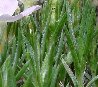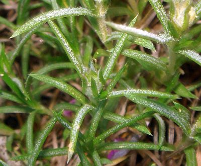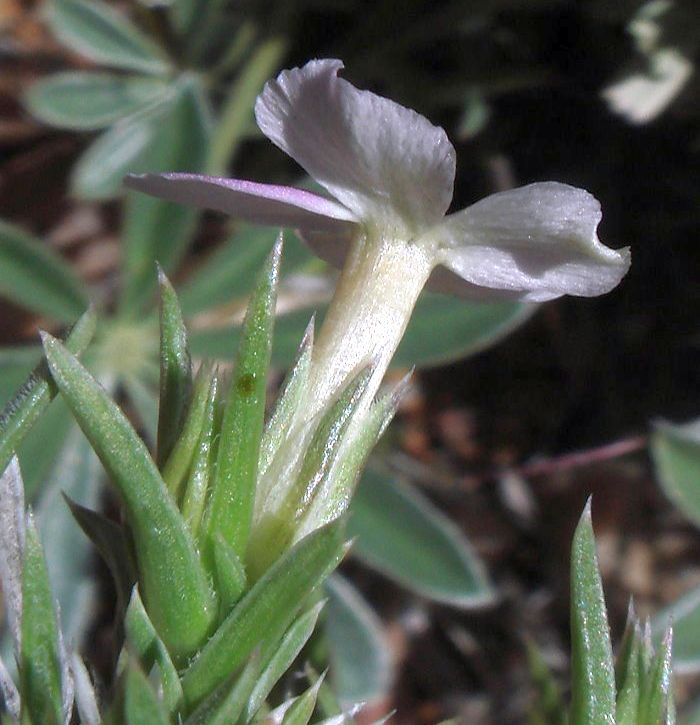 ~90% of leaves abruptly tapered near tipLength of tan-colored portion of leaf tip 0.5-1.0 mm 0.3-0.6 mm Calyx length 6.5-8 mm in samples from one area 8-10 mm Calyx membrane keel clearly pleated / keeled usually not keeled, sometimes wrinkled or weakly keeled Calyx membrane hairs absent or short, somewhat appressed, 0.1-0.5 mm long hairs always present, (0.5)-1-2 mm long, spreading, jointed (multicellular), often with bends at joints The photographs on this page appear to show that the corolla tube is more slender relative to the calyx for P. diffusa, but I have very little data on whether this is true in general.