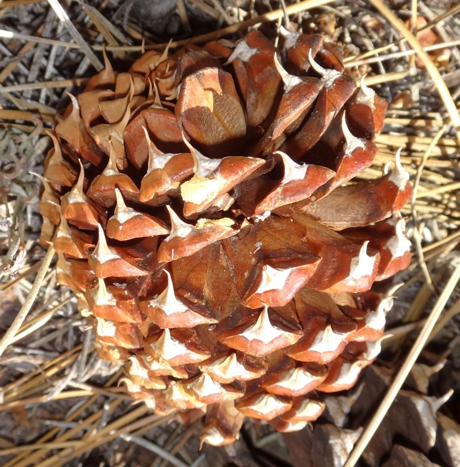 Complicating the problem for botanists is that a widely-known mnemonic, "Prickly ponderosa, gentle Jeffreyi", that claims to separate the species by how prickly the cone is, is largely useless in southern California unless the cones are closed from recent rainfall, and even then is not a highly-reliable characteristic. Tom has measured a lot of cones for the length measurements reported below, and picking up the cones of either species can be a prickly experience. Tom has actually been prickled more in picking up Jeffrey cones than by picking up ponderosa cones. Jeffrey cones often have a much more wicked prickle, which is easy to contact in picking up open cones.