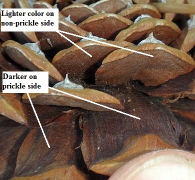 95%Cone scale colorbrown on both top and bottomgen darker (blackish) on prickle side than on the other sideSee Fig. 3.