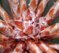 The vegetative buds appear quite different between the two species, see Fig. 5. The floras only mention that ponderosa buds are resinous, and Jeffrey buds are not. We were surprised to see a much bigger difference, with prominent acute bracts in the Jeffrey buds as they are breaking dormancy, and not prominent at all in the ponderosa buds as they are breaking dormancy.