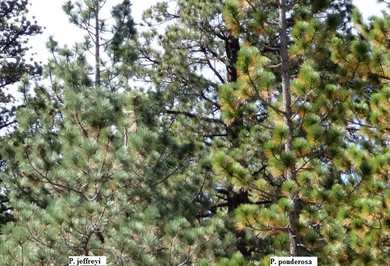 Worse, in some locations, some Jeffreys have greener colors than others, and hence having two colors side by side is not proof by itself that one is a ponderosa. In those cases, a Jeffrey needle sample compared to a ponderosa needle will still reveal the difference.