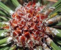?Immature cone colorbrown; light green to reddish-purpleyellow; light yellowish-greenThe first-mentioned colors for each species are given by Minnich and Everett 2001; the second-mentioned set is given by Haller and Vivrette 2011. We have not yet tried to verify this.