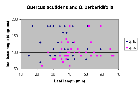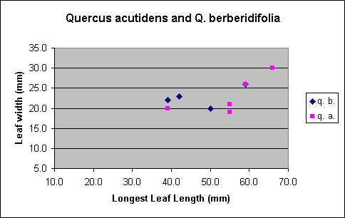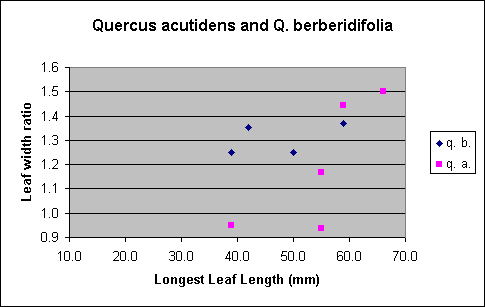 I present in detail the observed properties of Q. acutidens and "Q. berberidifolia". The density of the leaf trichomes is by far the best way to discriminate the two species. Leaf color may also be a fairly reliable discriminant. The species have different distributions of leaf and petiole length, but the overlap is large, making it difficult to use these as a discriminant for many specimens.