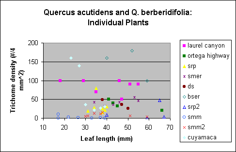 The one stand of "Q. berberidifolia" that I have examined in the Santa Monica Mountains also seems to be a stabilized introgressant species, and is not the Q. berberidifolia of the literature. However, data from many other locations in the Santa Monica Mountains need to be collected and examined to understand if this feature is widespread.