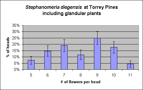 These histograms are identical to within the error bars, and both are consistent with a smooth, single-peaked curve within their error bars. It is also possible that the true histogram actually has two peaks, one close to 6-7 flowers per head and another close to 9-10 flowers per head. Such a distribution is also consistent with my histogram within the error bars. However, a distribution with two peaks is ruled out when the S. diegensis specimens from the Santa Rosa Plateau are included in a similar plot shown below.
