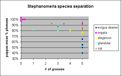 I have plotted this population from the SRP on top of the plot presented earlier which separates the three Stephanomeria species based on pappus plumosity and the number of grooves in the seeds: