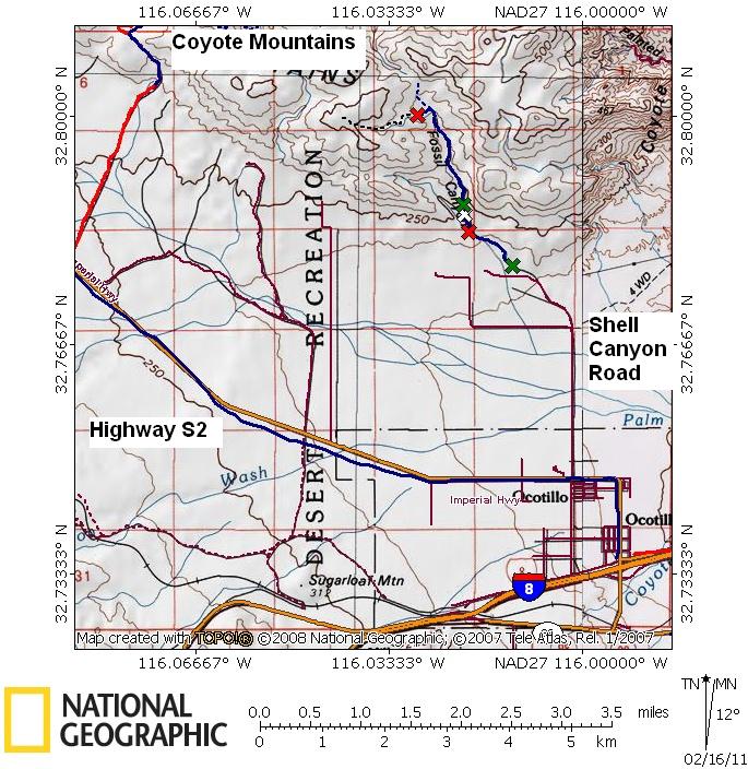 The Coyote Mountains are in southwest Imperial County, just north of the town of Ocotillo; see area locator map. Fossil Canyon is a canyon on the south side of the Coyote Mountains, in between the Domelands to the West and Painted Gorge to the East, shown on the following map: