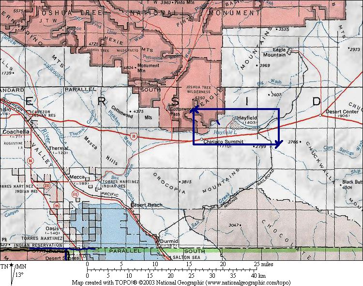 There is considerable disagreement as to which floristic province is best associated with this area. In the Jepson Manual, as well as a National Park Service site on the Mojave Desert, this area is on the southern edge of the Desert Mountains (DMtns) portion of the Mojave Desert (DMoj) province. In contrast, the Joshua Tree National Park Map, and Turner et al (1995) Sonoran Desert Plants, consider this area part of the Sonoran Desert (DSon).