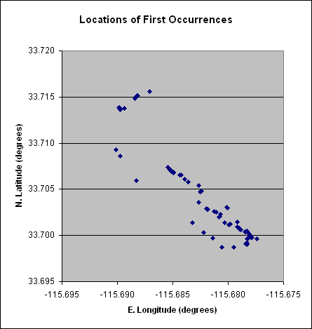 This plot shows the usual situation where many taxa are picked up at the starting point at lower right, with successively longer distances required to find new taxa until new habitats are encountered. In our survey, after picking up most of the species in the washes, significant numbers of new species began to be encountered only once we entered the canyons above the washes. Since we only surveyed the very lowermost portions of the canyons, our survey is very incomplete for species that occur in that habitat. But it should be fairly complete for species that grow in the wash habitat.