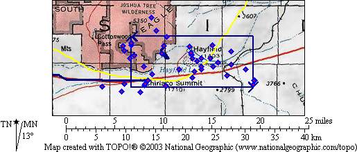 In addition to our survey, we have compiled vouchers from a larger area surrounding these washes that is centered on the Hayfield area. The area was chosen to include all of the nearby south-facing slopes, and measures five miles north-south and 13 miles east-west.