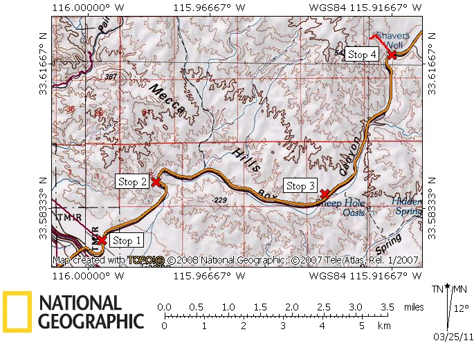 Fig. 1. Locations surveyed along Box Canyon Road on 23 March 2011. The first three stops were roadside surveys only, surveying only for Nemacladus species. At the fourth stop, Shavers Well, we surveyed for all plant species up about 0.5 miles of a side canyon, shown as the red line.We had only a single goal of surveying for Nemacladus species at the first three stops. Other plant species were only incidentally noted. At the fourth stop, at Shavers Well, we systematically surveyed for all plant species along the western side of Box Canyon Road, and for 0.5 miles up the wash shown as the red line in Fig. 1.