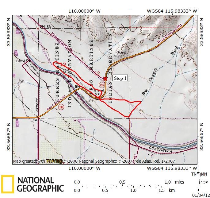 Fig. 2. The red lines show the approximate locations surveyed in extreme lowermost Box Canyon on 2 January 2012.It was notable that we found young plants of a number of perennial, shrub and tree species. Often there were large number of young plants, many of which seemed to be several years old. In many cases, there were no adults of those species present in this area, indicating that the seeds had washed down to this point from parent plants higher in the wash. Table 1 gives those species.