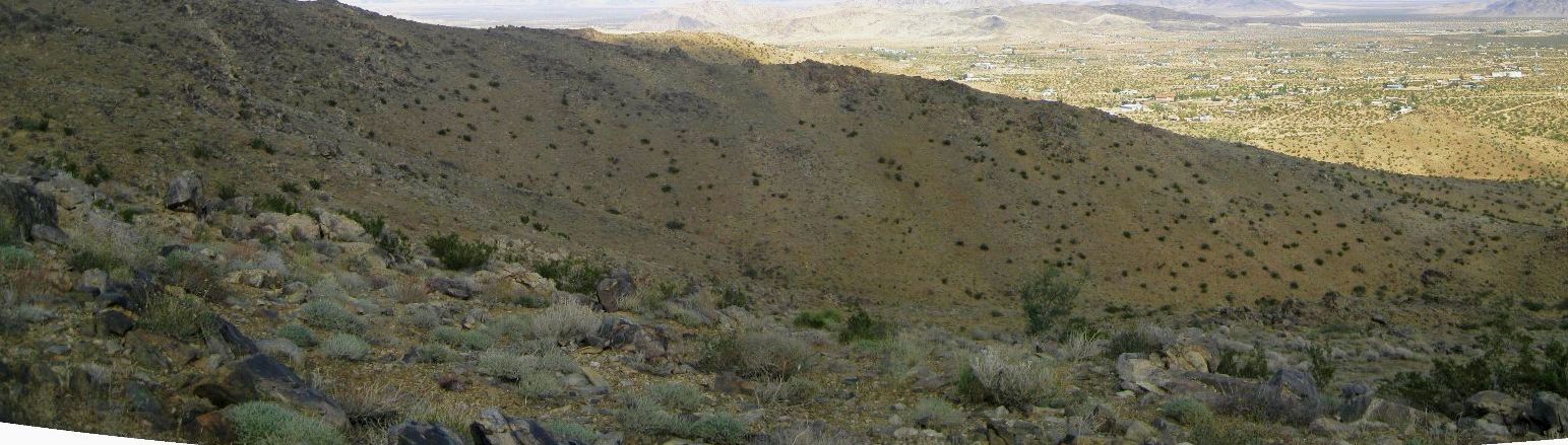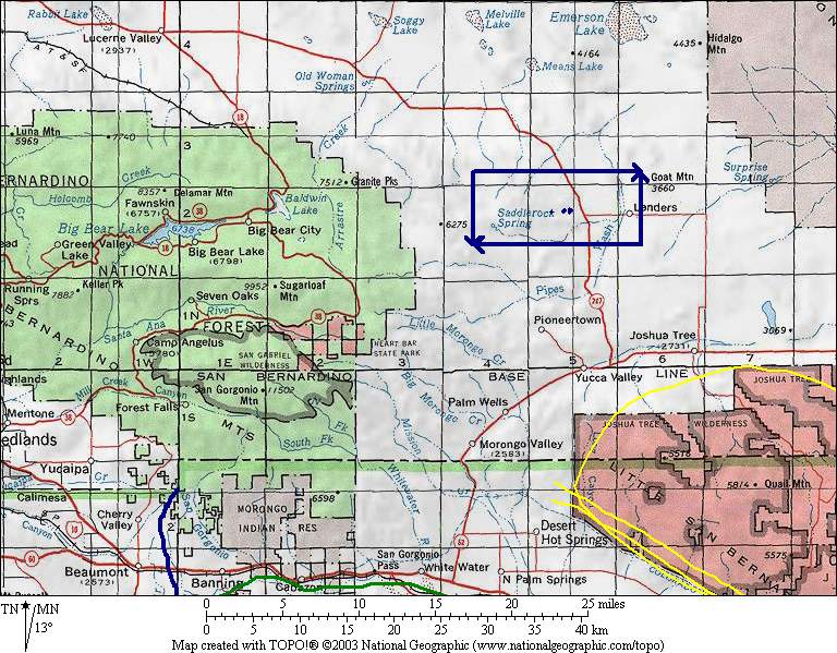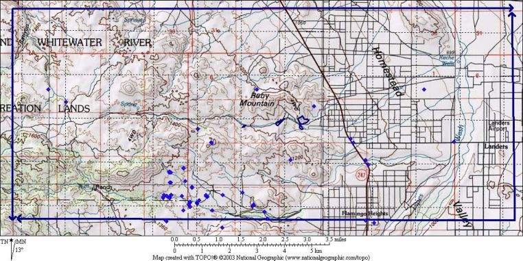 Location The New Dixie Mine Road is just west of the town of Landers in the Mojave Desert about 11 miles north of the northwest corner of Joshua Tree National Park. The area surveyed is where the east slopes of the San Bernardino Mountains meet the Mojave Desert in this area, at an elevation of about 4000 feet.