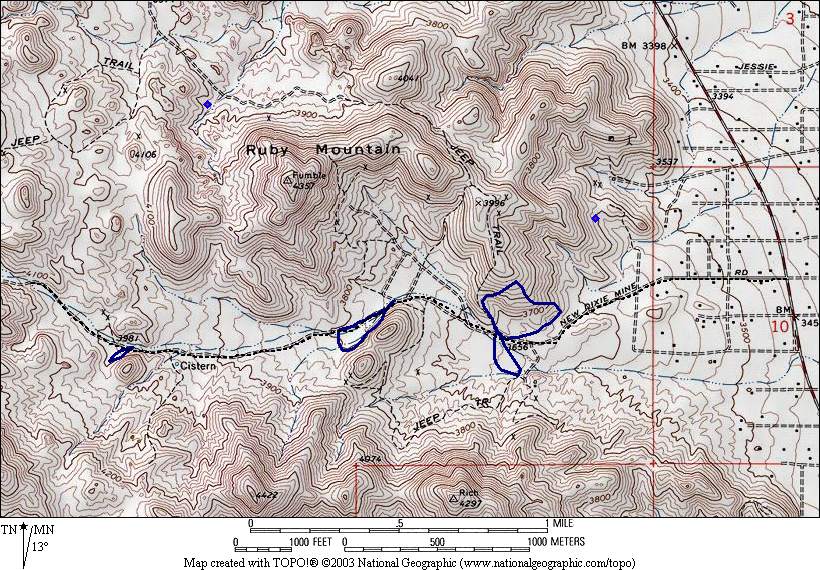 The paths we surveyed are shown in more detail below as the blue lines that originate in three different areas along the New Dixie Mine Road: