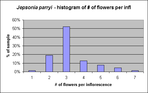 Tom histogrammed the number of flowers per inflorescence on 63 plants on the Granite Loop Trail at the Santa Rosa Plateau on 10/20/01, 11/3/01, 11/26/01, and 12/15/01, with help from Kay Madore on one of those trips. The histogram shows that 73% of the inflorescences had fewer than four flowers. The largest number of flowers per inflorescence was a single inflorescence with seven flowers.