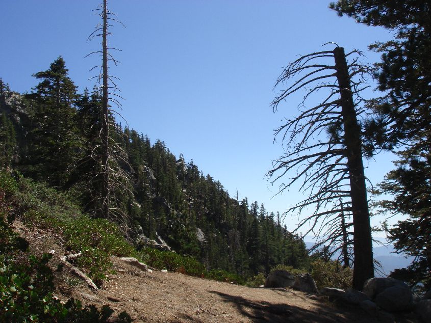 Often, the dead trees were the spitting images of the live trees, except they were without foliage, with each species have a characteristic form. Most of the dead trees seen on the Devils Slide Trail are white firs, Abies concolor, which usually have two distinctive characteristics: they have small branches relative to their trunk size (except for very large specimens); and they have dead branches that curl downward. Also, dead white firs sometimes retain dead mistletoe clumps, which is a dead giveaway since mistletoe is essentially found only on white firs at these elevations.