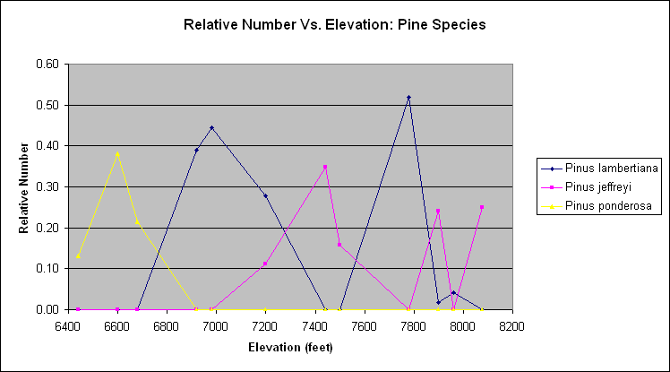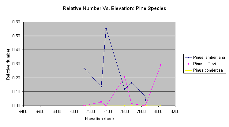 Pinus lambertiana is found at all the elevations in this survey, and it is also abundant at higher elevations as well. The dip in its relative abundance at two nearby survey locations, at 7440 and 7500 feet, is probably related to other factors, such as the steepness of the slope and its orientation.
