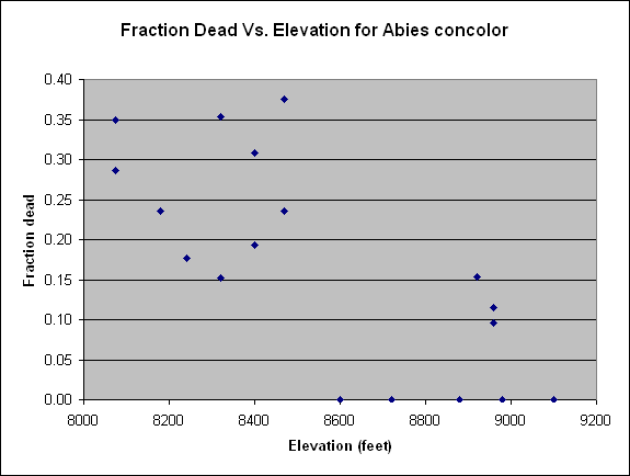 As also found on the Devils Slide Trail, the percent of dead Abies concolor is highest at its lower elevations. The following plot shows just the results of this survey, followed by a plot that includes the results from the Devils Slide Survey.