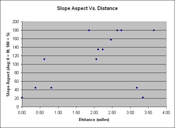 The survey route is approximately a north-south transect that has a minimum elevation at Saddle Junction in the middle. Since higher elevations are found both to the north and to the south, with very different slope aspects, the X-axis in the plots below is distance from the southernmost point. Since locations to the north often have south-facing slopes, and locations to the south often have north-facing slopes, this choice of X-axis separates those very different habitats.