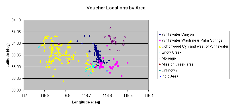 Due to the goal of completeness, I tagged all vouchers saying north of Whitewater as being in Whitewater Canyon, which is almost surely wrong for some of the vouchers.