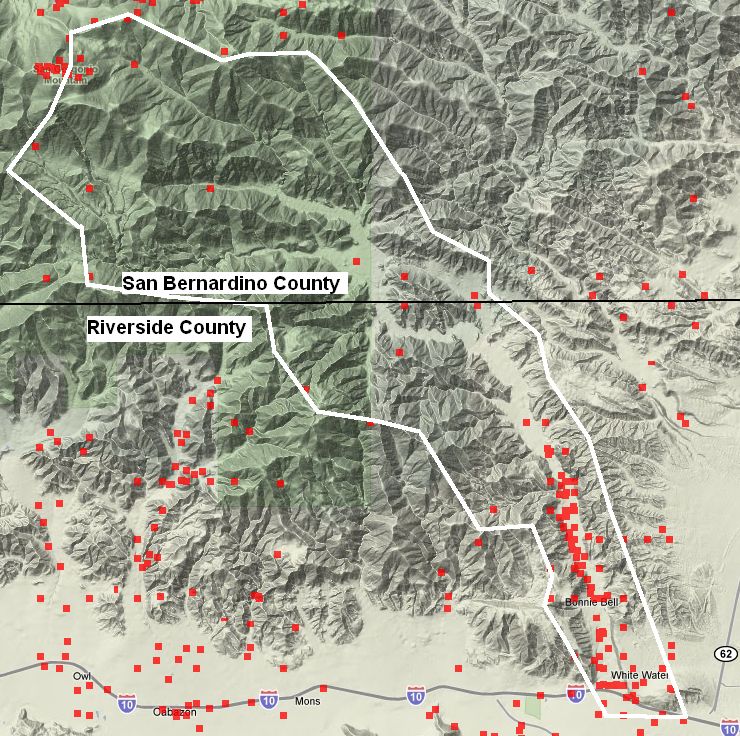 I augmented that search to find vouchers without coordinates by doing separate searches for San Bernardino County vouchers containing in turn the words Catclaw, Whitewater, Raywood. Those searches found an additional 20 vouchers that were actually in San Bernardino County, and 58 vouchers that were actually in Riverside County, even though the county was recorded as San Bernardino County. All of those vouchers were added to the appropriate section of Whitewater Canyon.