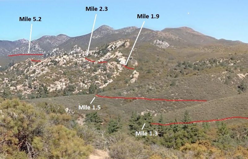 Plant Guide to Pacific Crest Trail North of SR74, San Jacinto Mountains - Garner Valley Area Fig. 1. View to the north from mile 0.55 of the PCT, showing the interesting bouldery area traversed by this section of the PCT, with visible sections of the trail labeled by mileage from SR74. Click on the photo see a larger area.