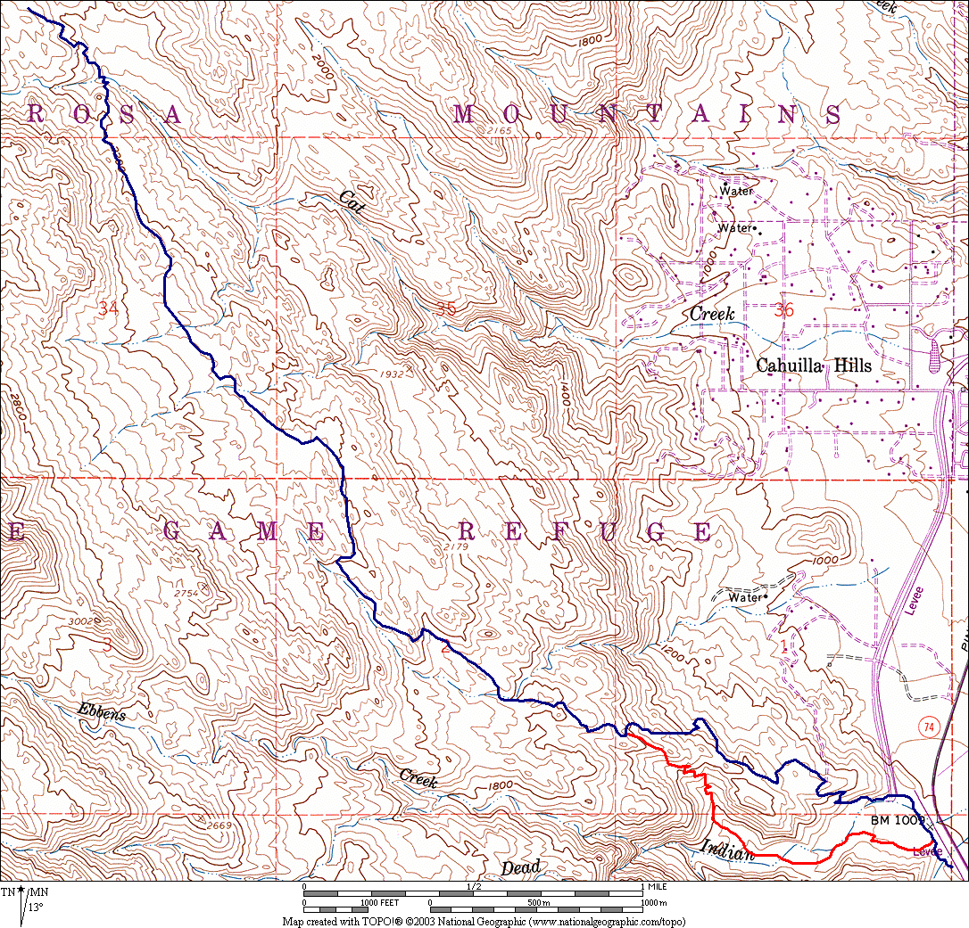 The old trail is stunningly beautiful, a classic trail like the alternate Borrego Palm Canyon Trail, an excellent trail going through an excellent area. In contrast, on the new trail, you first have to traipse along the base of an ugly levee, through either water, mud, or huge dried mud polygons, through the only large collection of non-native weeds in the area. You then steeply ascend a south-facing, almost-barren slope that dumps you in an area above homes, water tanks and a golf course. It meets a maze of side trails that remind one of off-road vehicle routes (I don't think they are, but it isn't a very pretty area compared to the old trail).
