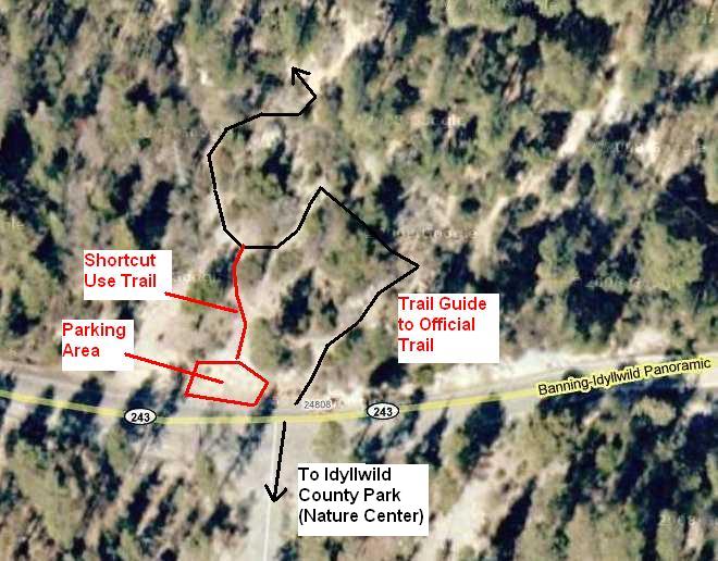 Parking is extremely limited in the area. There are perhaps 10 spaces on the shoulder of SR243 immediately at the trailhead, and designated parking for perhaps another 10 cars at the signed parking area just west of the trailhead. Parking for the trail is no longer permitted at Idyllwild County Park, despite the presence of a fairly large usually-empty lot just south of the trailhead.
