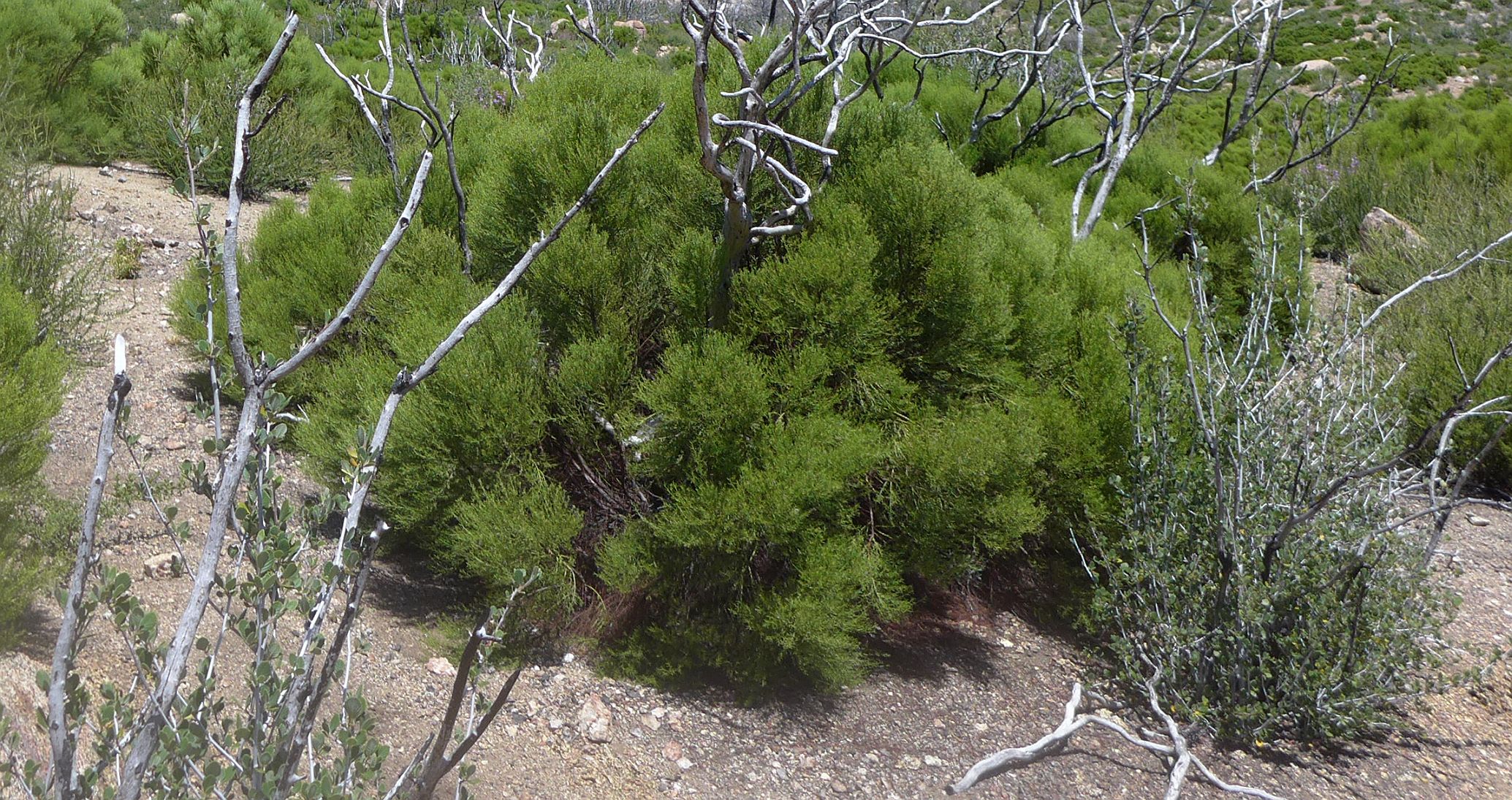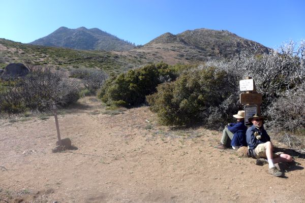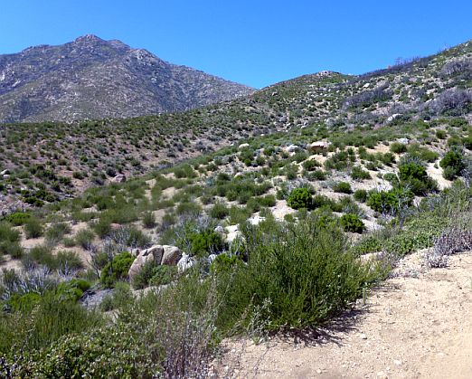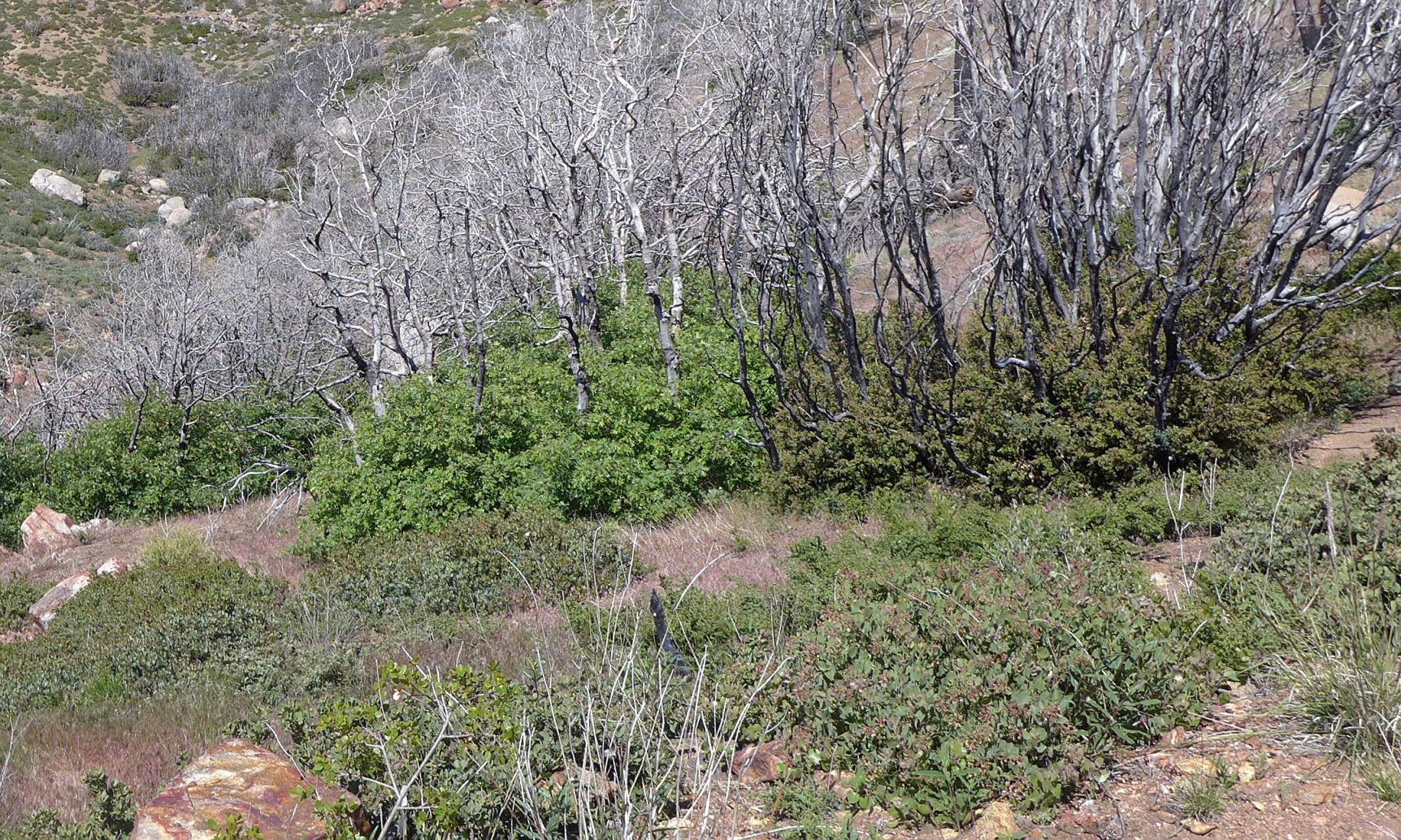 Comparison of photos before and after 2013 Mountain Fire Fortuitously, Mena Schmid took a number of photographs from this trail on 2 May 2009 before the 2013 Mountain Fire. Tom Chester, RT Hawke, Shaun Hawke, Keir Morse and Nancy Accola attempted to reproduce four of those photographs on 13 May 2017, nearly four years after the fire, in order to show how the vegetation differed before and after the fire. We didn't get an exact match for most of them, but the views are clearly the same, allowing a direct comparison of the vegetation.