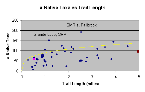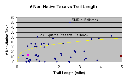 The number of non-native taxa is remarkably low. Many of the points with fewer non-native taxa are from higher altitude trails (see the first plot above).