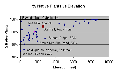 The number of native taxa is lower than many of our other trails. It is possible that this simply reflects the incompleteness of this guide so far. It could also be due to the low rainfall along this trail, compared to most of our other trails. This trail is in the rain shadow of the Palomar Range, and Banks maps most of this trail as being primarily influenced by the desert. Only the upper portion is under montane influence.