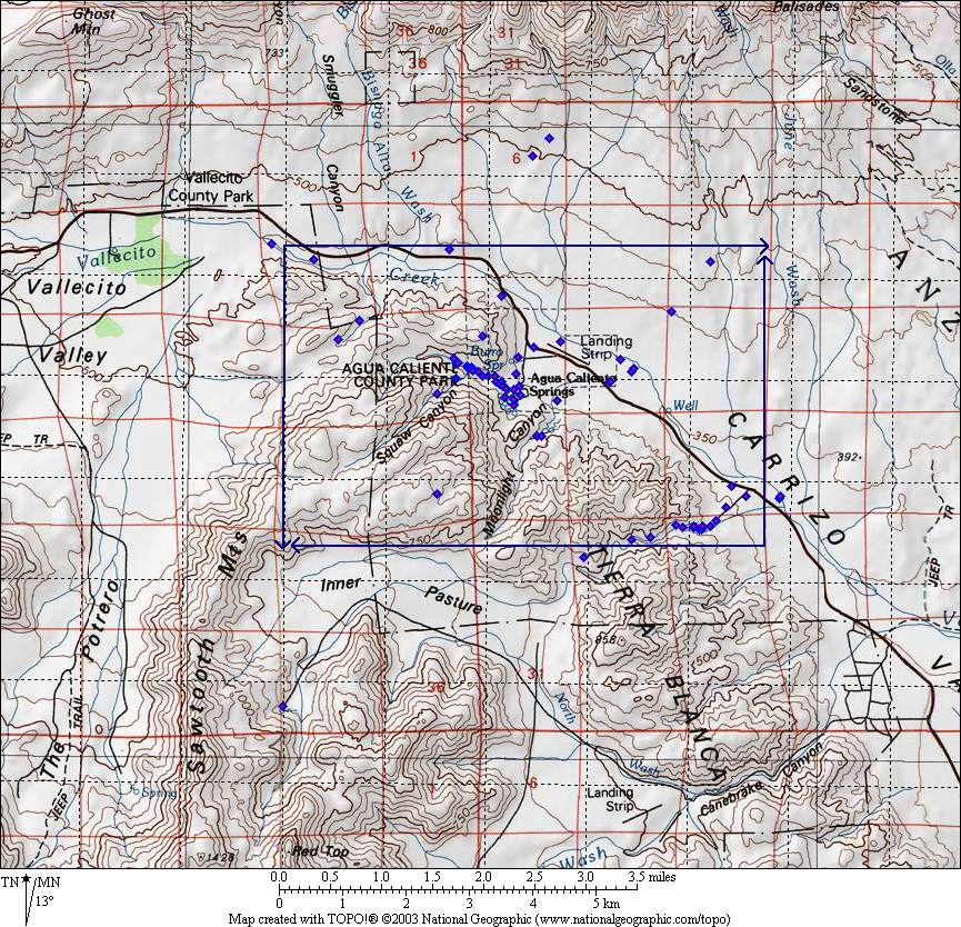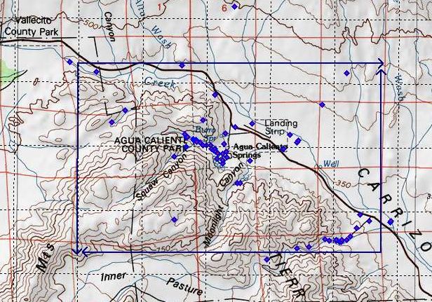 The Consortium records were searched for vouchers with coordinates between 33.928 and 33.971° N. Latitude, and -116.26 and -116.342 E. Longitude. Localities of those vouchers were examined, and additional searches were made to find ones in San Diego County from those localities, including Agua Caliente; Moonlight; Squaw Canyon; and Tierra Blanca. The detailed localities of those vouchers were examined and ones not definitely in the target area were eliminated. In practice, that eliminated all additional vouchers except for ones containing the words Agua Caliente.