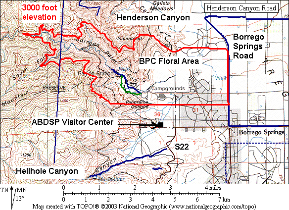 Only the portion of the Canyon below an elevation of 3000 feet is included in the Flora presented here. The boundaries of this Flora are shown in red in the map below (BPC = Borrego Palm Canyon):
