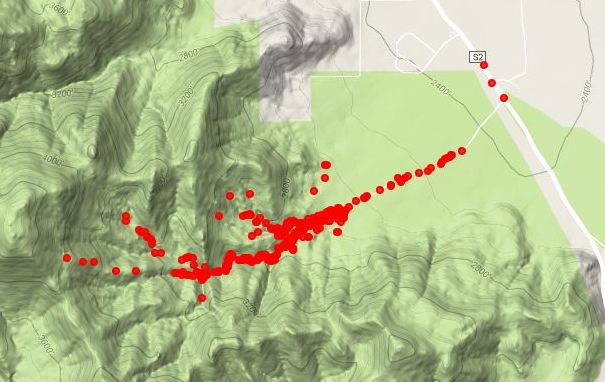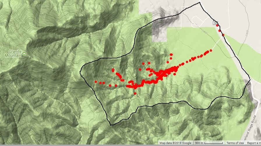 Fig. 2. All locations where species have been recorded for the flora of Cool Canyon. Click on the picture for a larger version. A breakdown of the sources of the species GPS points are: