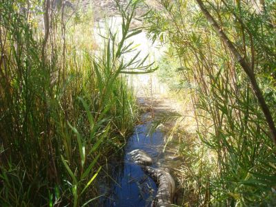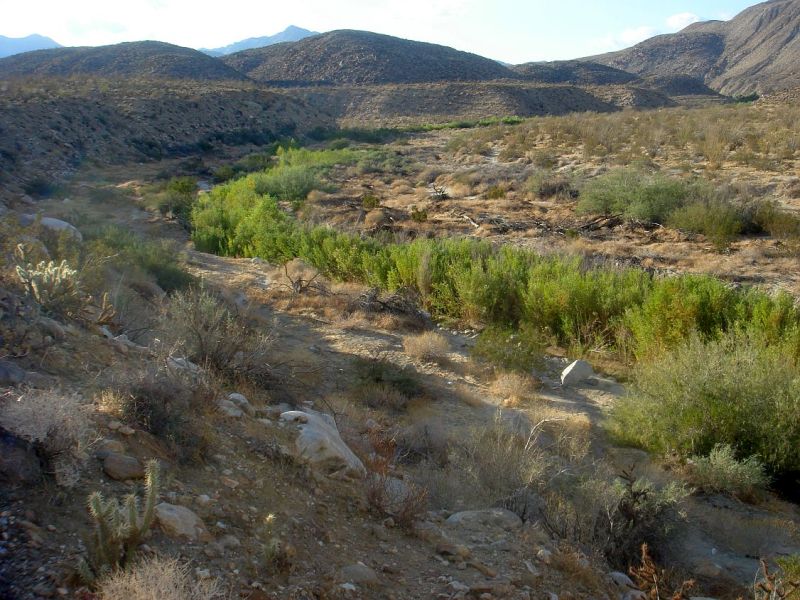 Bedrock bottlenecks force its water to come to or near the surface at Upper, Middle and Lower Willows. Santa Catarina Spring at Lower Willows covers an area of several acres and is the largest single natural emergence of water in San Diego County (Anza-Borrego A to Z, Lindsay 2001, p. 310). Water from the spring creates a year-round flow of water at Lower Willows through Lower Coyote Canyon, a narrow canyon which abruptly opens to the desert floor, with its deep sandy alluvial soils. The water begins to sink into its sandy bed and above-ground flow eventually ends.