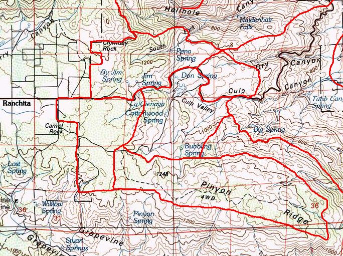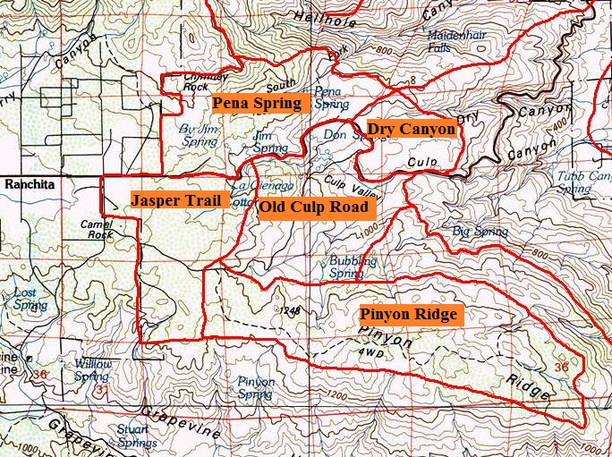 Area Min elevation (feet) Max elevation (feet) Elevation range Pena Spring 3200 4800 1600 Pinyon Ridge 3700 4573 873 Jasper Trail 3680 4250 570 Old Culp 2800 4000 1200 Dry Canyon 2800 3400 600