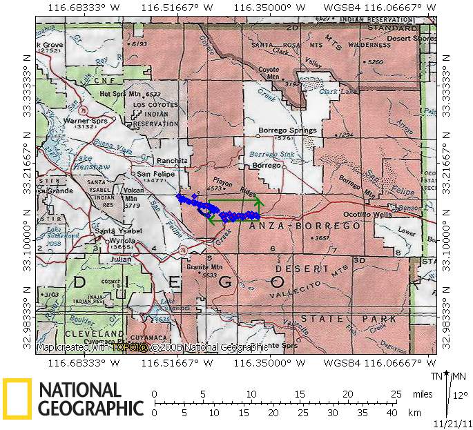Voucher locations are plotted with blue diamonds. Our single survey location is plotted as a heavy blue line, which includes a section of Grapevine Canyon Road that is obscured by voucher symbols. The voucher coordinate search box is outlined in green (see below). (See also larger-scale map to locate Grapevine Canyon within Anza-Borrego Desert State Park.)