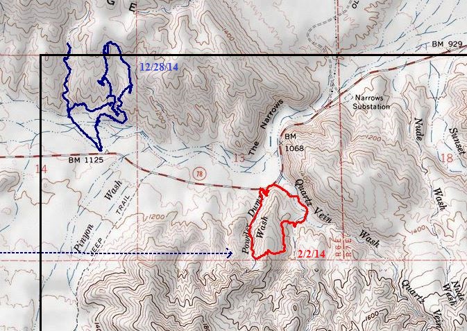 The trip on 2 February 2014 was a loop in Powder Dump Wash / Quartz Vein Wash, done primarily to map the Tiquilia canescens population here. We also recorded all the species we saw, which totaled 63. The area appeared very dry and drought-stressed during this survey, so nearly all annuals and perennials are missing from this field survey.