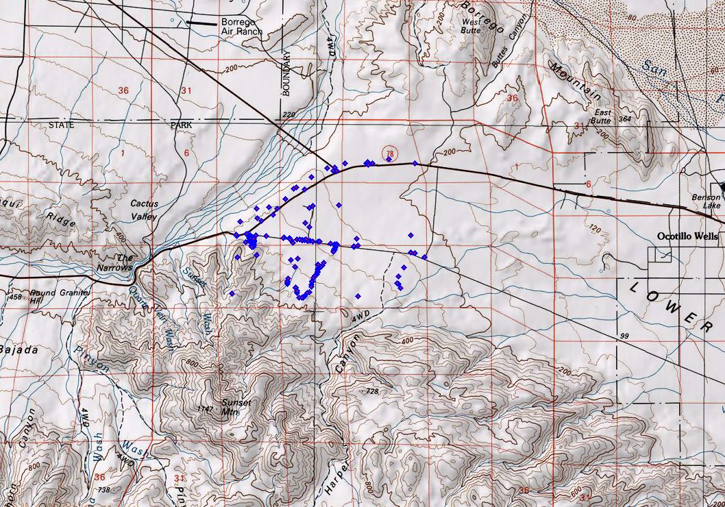 One voucher from 1935 has a locality that sounds like it should be in this area, of Kane Spring Road beyond Narrows, but it is of Xylorhiza orcuttii which is very unlikely to grow in at least this western part of Kane Spring Road. It even seems unlikely that it grows in the eastern part of Kane Spring Road since Fred Melgert and Carla Hoegen's in-depth surveys for this species show the closest known plants are on the northwest side of the West Butte of Borrego Mountain and near Split Mountain. It is possible that the collector took what is now called Split Mountain Road from that part of Kane Spring Road and went to the Split Mountain location, and gave just the vague locality on the voucher. So we tossed this voucher as well.