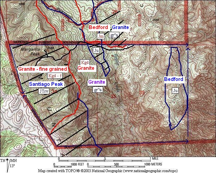 The following map gives the geology from the printed 1966 large-scale Santa Ana Sheet Geologic Map of California, and from the 2001 Preliminary Geologic Map 2001 of the Margarita Peak Quadrangle (5 MB).