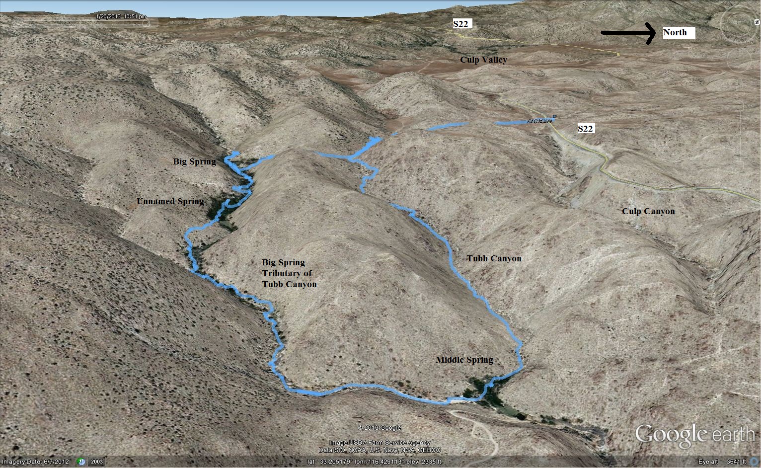 Introduction The Big Spring tributary of Upper Tubb Canyon must be one of the best-kept secrets of Anza-Borrego Desert State Park. We, and zillions of other people, have driven S22 starting down the Montezuma Grade without having any idea that the very dry landscape around S22 harbors not only a "Big Spring", but a creek with over a half-mile of year-round flowing water! We were simply dumbfounded to discover this the first time we looked at a Google Earth view of the area, and saw the extensive stretch of vegetation along it.