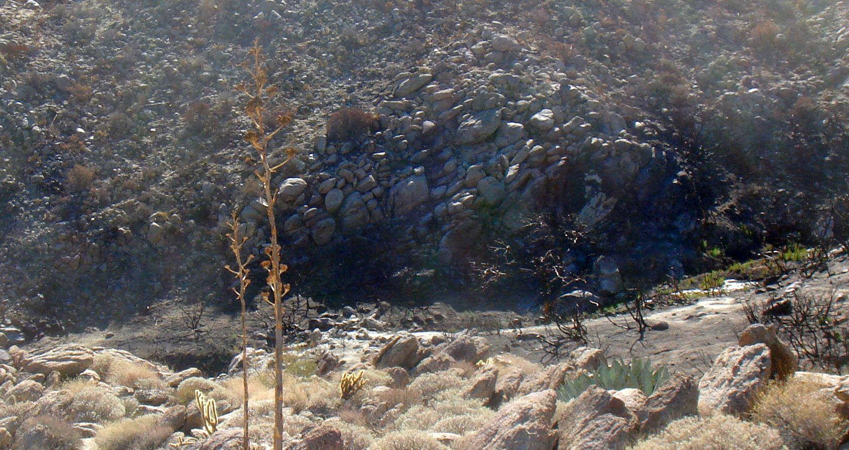 Flora of Upper Tubb Canyon / Big Spring, Anza-Borrego Desert State Park Fig. 1. Google Earth View of Upper Tubb Canyon / Big Spring Area. The route surveyed on 17 January 2013 is shown in blue. It is probably only possible to do that loop immediately after a fire. Click on the picture for a larger version with landmarks labeled.