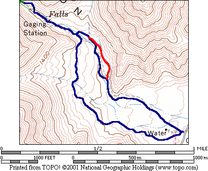 The trail from mile 0.14 to 0.35 is shifted left of the old trail, and the stream-crossing is at a slightly-different location. The surroundings between mile 0.27 and mile 0.34 have been changed tremendously by the 9/04 flood, and many of the plant taxa were taken out by the flood. Presumably, most of those will eventually return.