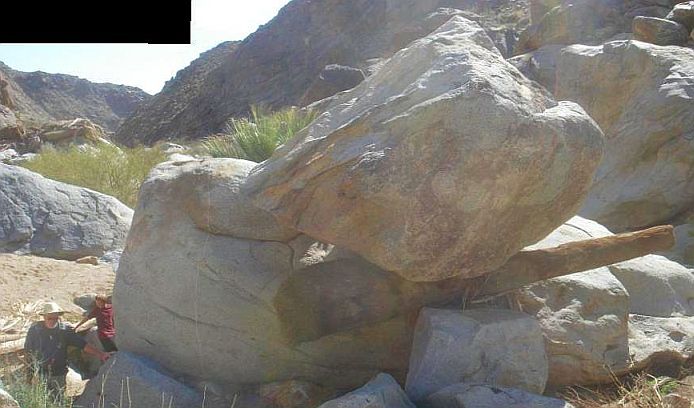 The second one, on 10 September 2004, has been described as a 100 year flood, and we believe it. A 5-10 foot tall, 100 feet wide wall of water was observed at the campground, coming out of the mouth of Borrego Palm Canyon. That flood took out a large number of palm trees (~80% of the individuals in the First Grove), leaving them scattered along the lower portions of the trail, and sometimes in stacks of three palm trees angled on top of each other. Many of the trunks were broken by the force of the water, and some palm tree trunks even ended up below large boulders!